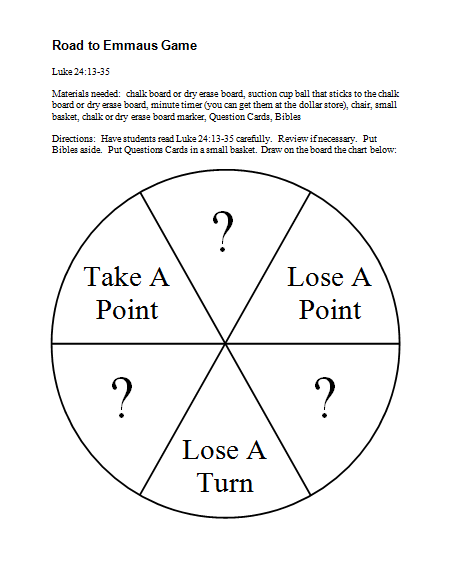 Road To Emmaus Game- Review Luke 24:13-35. Draw on the board a chart and have the players throw a suction toy at the board. Where ever it sticks, the team has to follow the directions. The team with the most points wins.