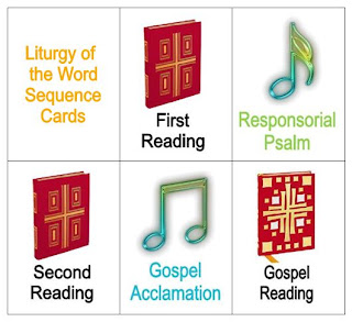 Liturgy of the Word Sequence Card Game- For 2 to 4 players print out on card stock at least 2 copies of each page (for more players print more copies). Shuffle cards and the Dealer deals out 4 cards to each player. Dealer puts cards down in the middle of the table, turns over the top card, and places it beside the deck. From the cards in his hand the Dealer must place the next card in the sequence of the Liturgy of the Word on top of the card facing up. If he does not have the proper card, he must draw a card from the deck. Play moves clockwise. If the deck runs out, play moves to the next player clockwise and game continues. The first player to run out of cards wins.