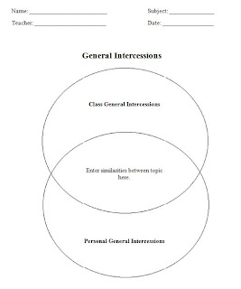 Have the students draw a Venn Diagram. Have them write the similarities and the differences between what the class thinks the general intercessions should be and what they personally think they should be. (Write details that tell how they are different in the outer circles. Write details that tell how they are alike where the circles overlap.) Discuss.