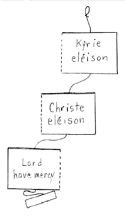 Say to the students and point to each line accordingly: We are all standing during the “Lord, have mercy”. The priest says, “Lord, have mercy.” What do we say, (“Lord, have mercy.”). Then the priest says, “Christ, have mercy.” What do we say? (“Christ, have mercy.”). Then the priest says, “Lord, have mercy.” What do we say? (“Lord, have mercy.”)