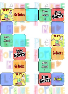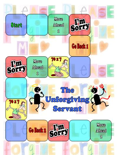 The Unforgiving Servant File Folder Game: Players move around the board by apologizing correctly for things they have done wrong while other players forgive their transgressions. The players must say what they should do to correct their mistake and/or what consequences should happen to them so they will learn to take responsibility of their actions. Players must also answer questions about the story “The Unforgiving Servant” to receive a token. The player who reaches FINISH and has the most tokens wins the game.
