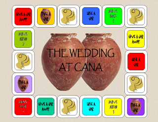 The Wedding At Cana File Folder Game: Answer questions about the story and receive a jar token. The first player to collect 6 jars wins. (Younger students do not have to answer a question and can just collect a jar token.)